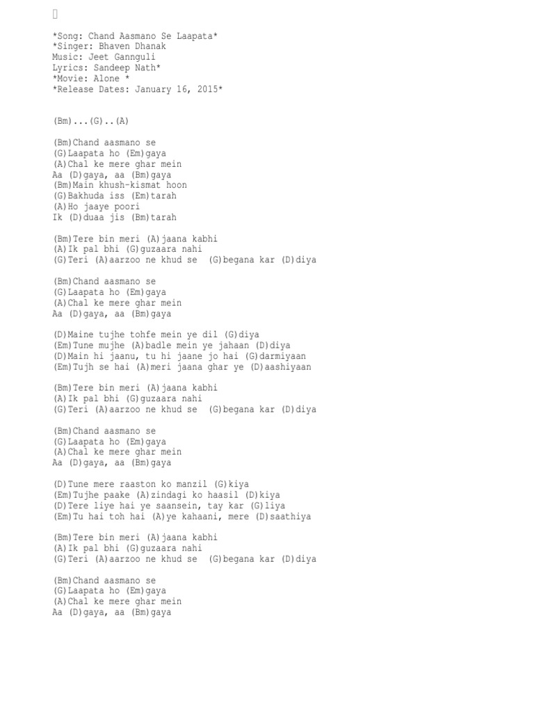 United Lyrics Chand Aasmano Se Lapata Ost Alone Lyrics Bhaven Dhanak Chaand aasmanon sey lapata ho gaya chal key mere ghar mein aa gaya, aa gaya mein khush qismat hoon ba'khuda is tarah ho jaaye poori ik dua jis tarah tere bin meri jaanan kabhi ik pal bhi guzaara nahi teri aarzoo ney khud sey begana kar.